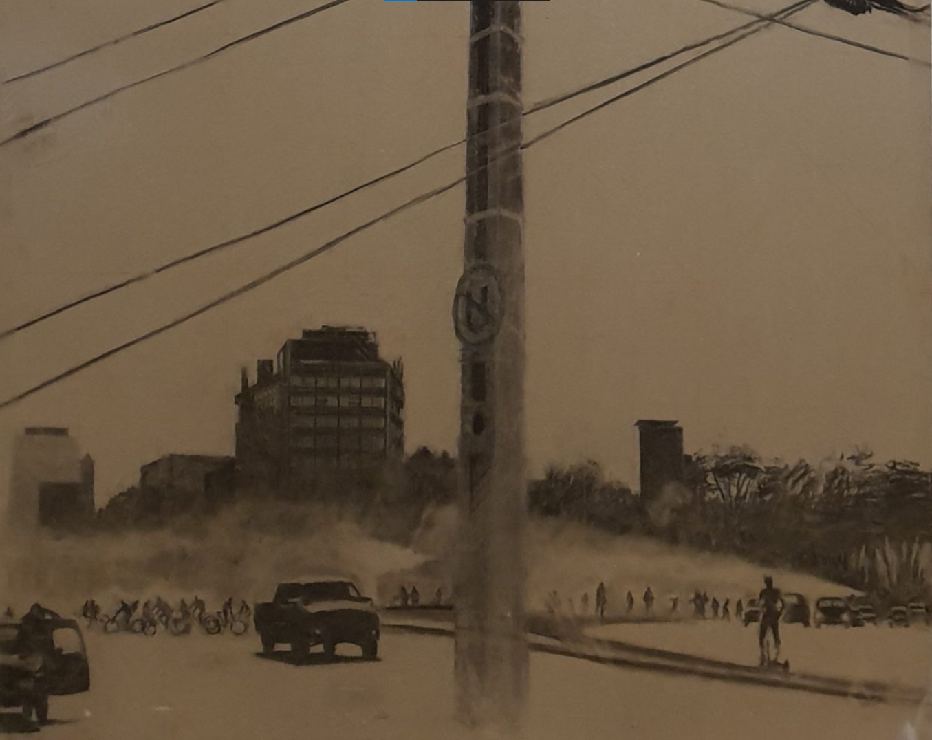 Boceto digital. Es una superposición de capas, una de ellas de fotografía tomada saliendo del supermercado, y la otra el de detalle de un dibujo -digitalizado- de carboncillo sobre panel de cartón-yeso de la serie de trabajo de «Esta exposición no tiene nombre». Las capturas fotográficas, la digitalización del dibujo y el montaje lo realicé en un teléfono celular Samsung Note 10 y con el software Sketchbook de AUTODESK
