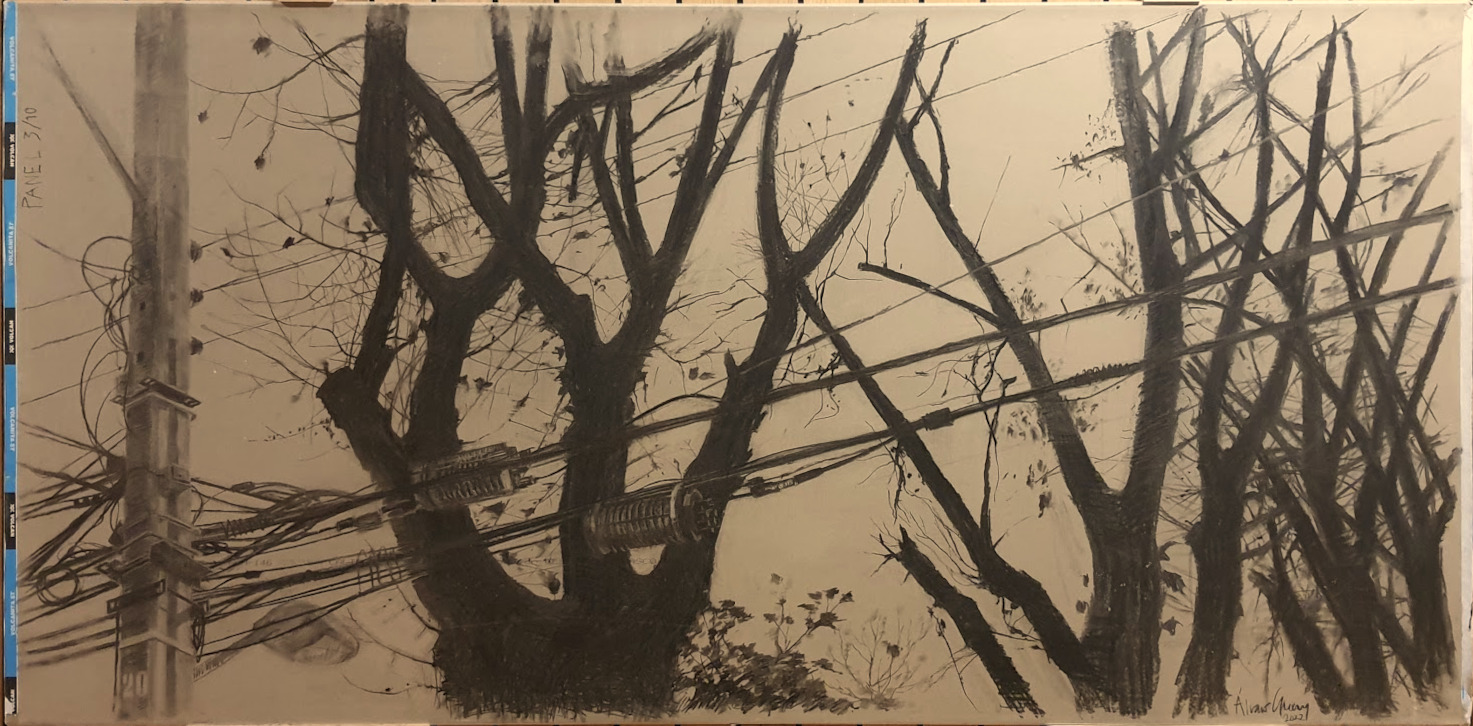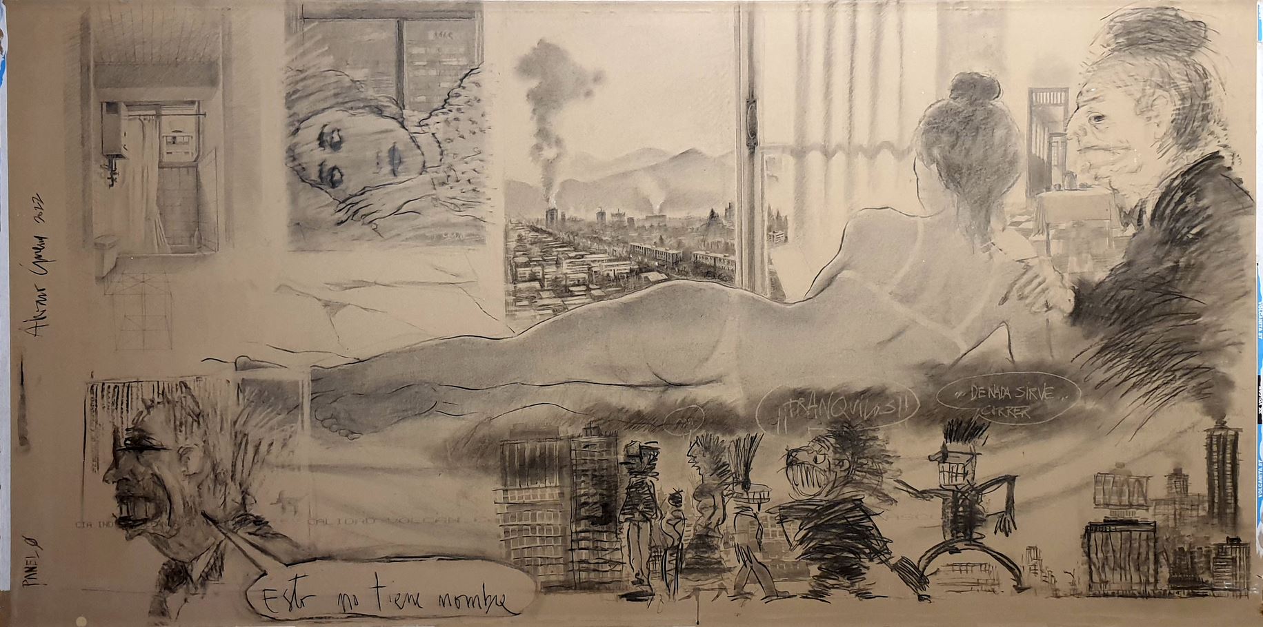 Esta exposición no tiene nombre Dibujos de exposición realizada en Octubre – Diciembre del 2024 en el Centro de Arte Alameda Carboncillo sobre panel de cartón yeso 1.20 x 2.40 m Dibujo 001